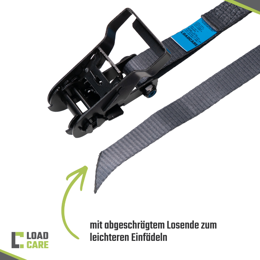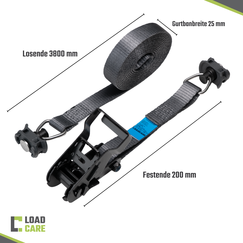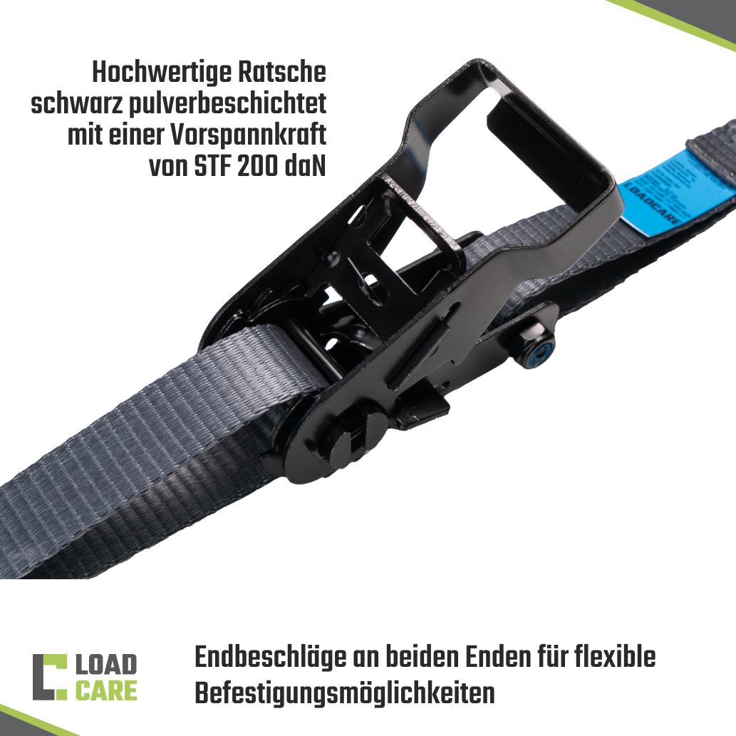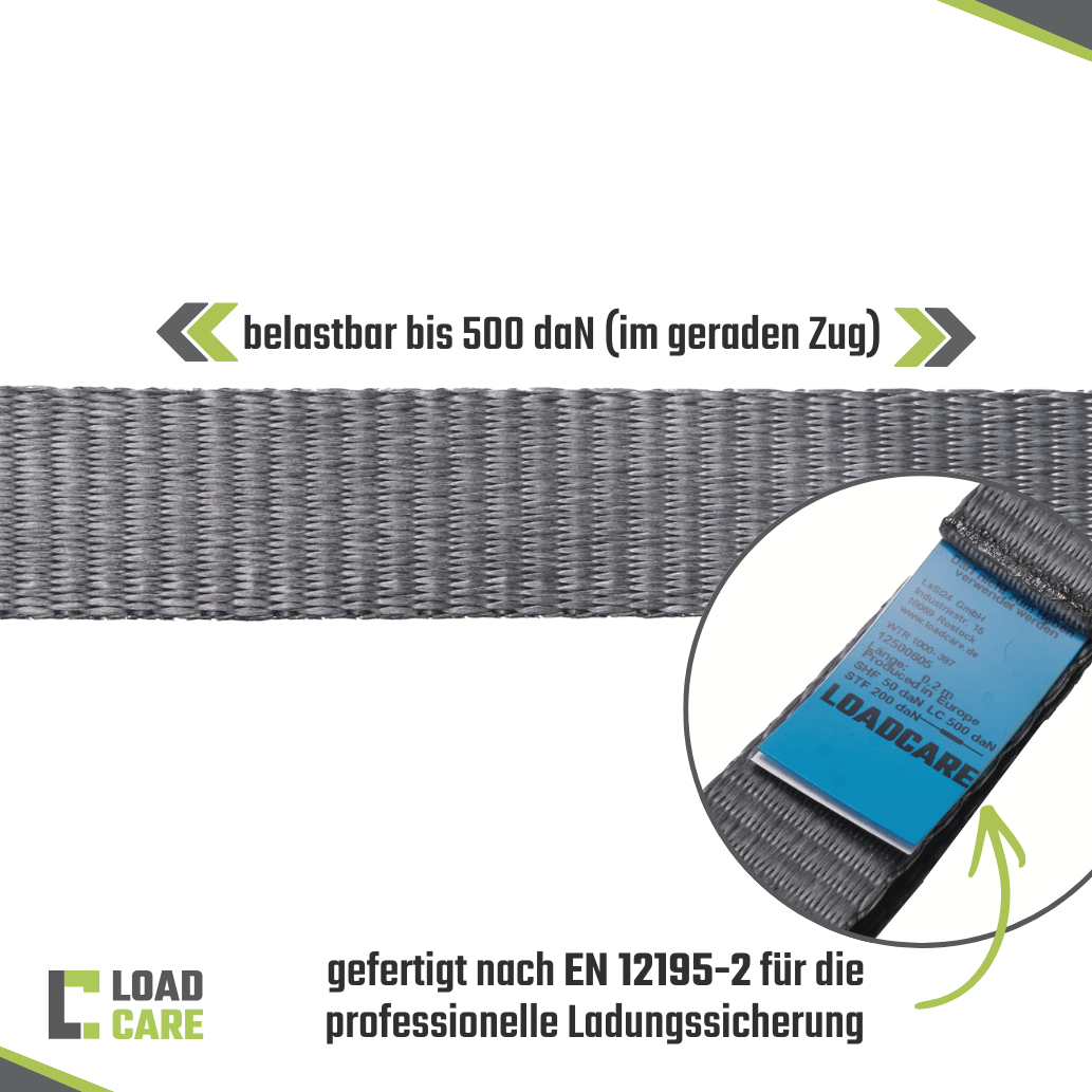 - Hochwertige Spezifikationen: Mit einer Länge von 4000 mm und einer Breite von 25 mm bietet der Gurt eine Zurrkraft (LC) von 500 daN im geraden Zug und eine Vorspannkraft (STF) von 200 daN. Der Gurt entspricht den höchsten Sicherheitsstandards gemäß DIN EN 12195-2.