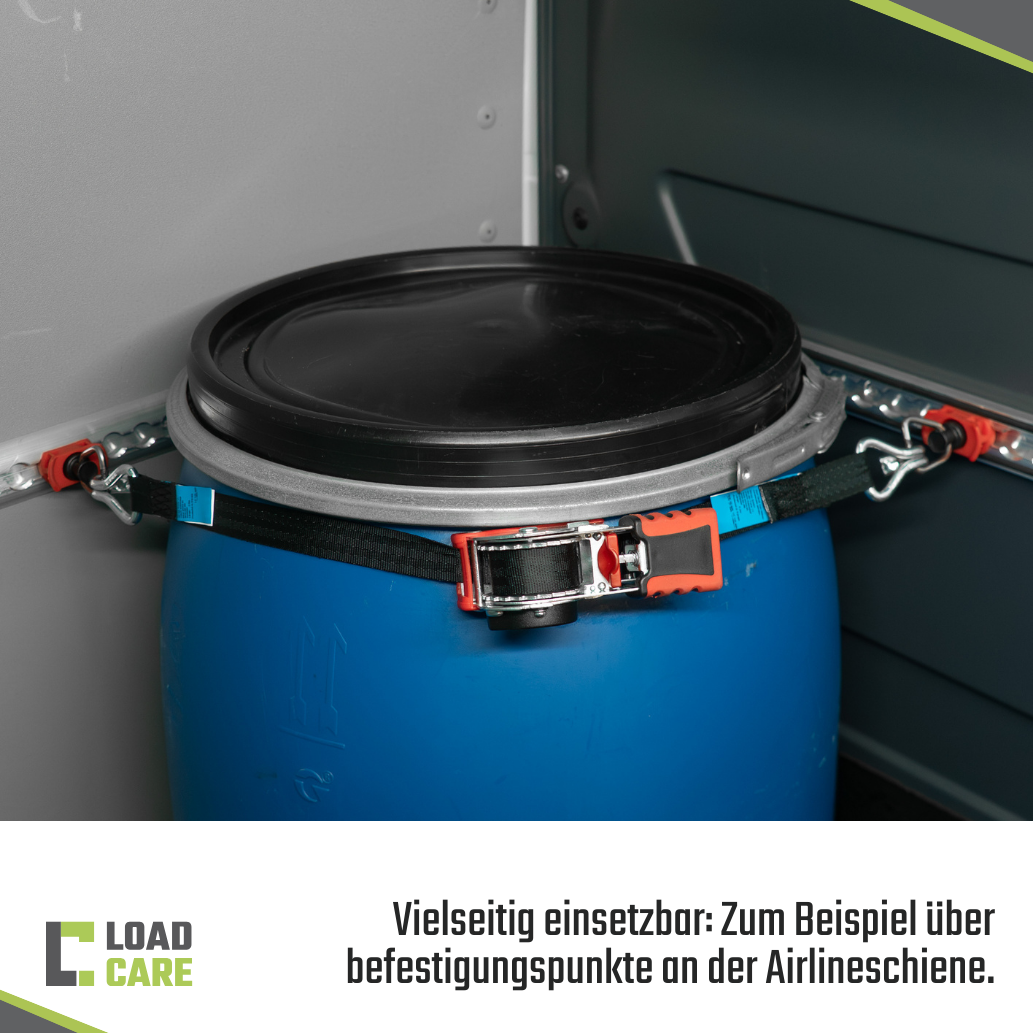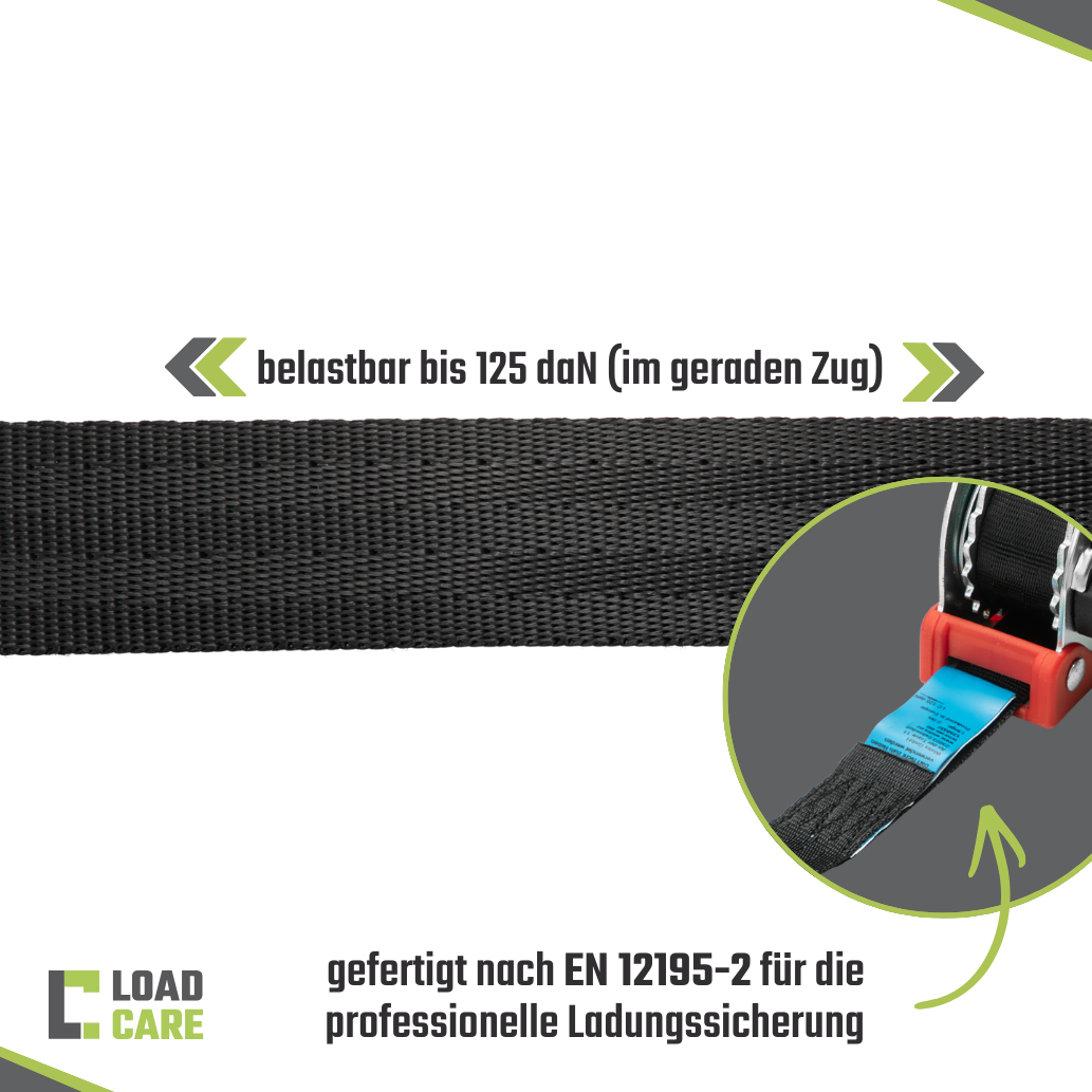 Geprüft nach DIN EN 12195‑2 bietet der Automatik‑Spanngurt eine Zurrkraft von LC 125 daN im geraden Zug sowie eine Vorspannkraft von STF 27 daN. Damit eignet er sich optimal zur normgerechten Ladungssicherung von Kisten, Rohren, Fässern, Werkzeug oder Gepäck.