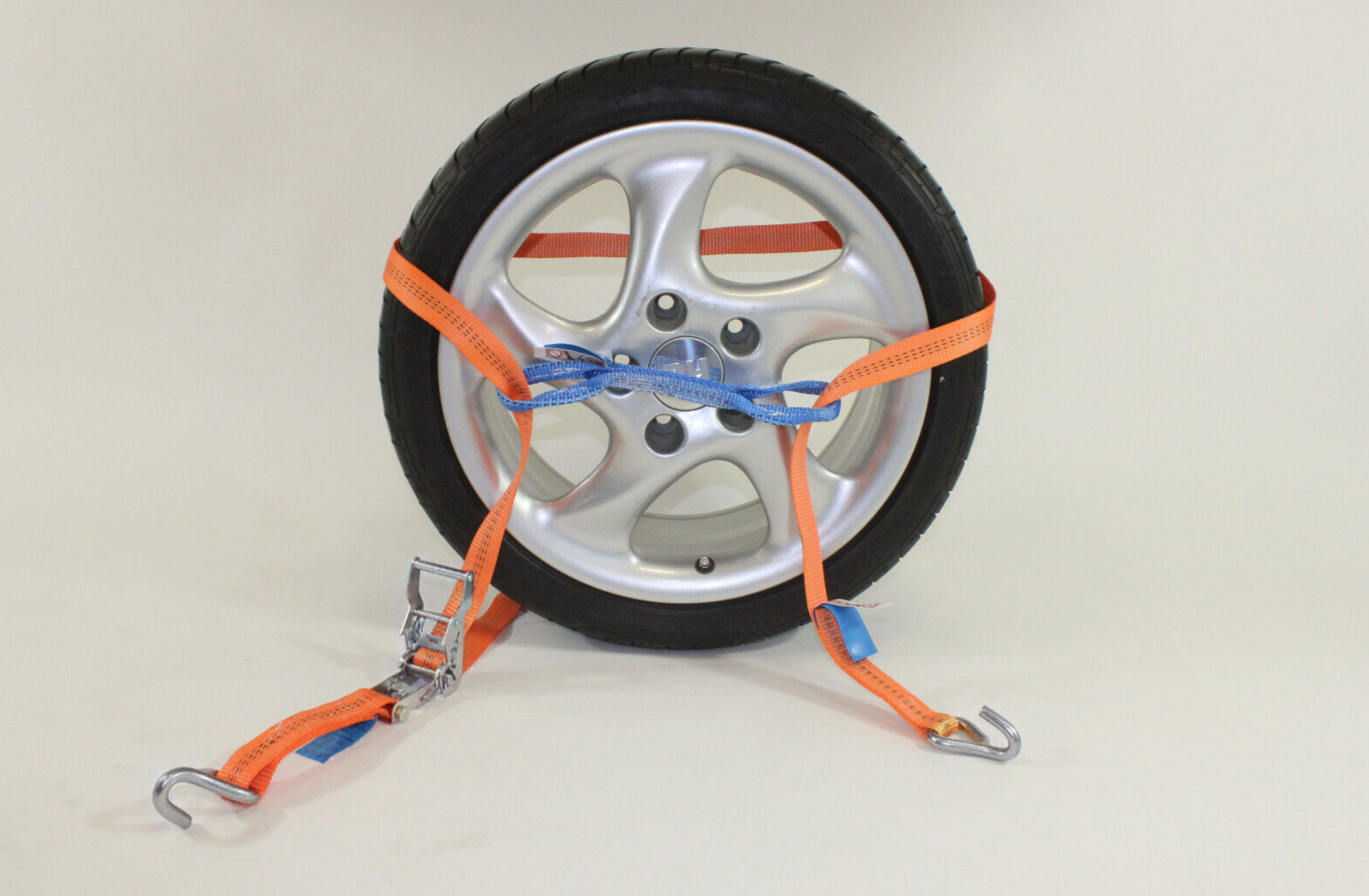 The LC 1000, the strap width of 35 mm and the elongation of less than 4% optimally meet the requirements of the Daimler Chrysler guidelines, which are primarily used for market and inspection purposes. So perfect for all wheel sizes, aluminium rims and steel rims (with or without hub caps). As they do not hook directly into any rim, they are also not scratched or damaged.