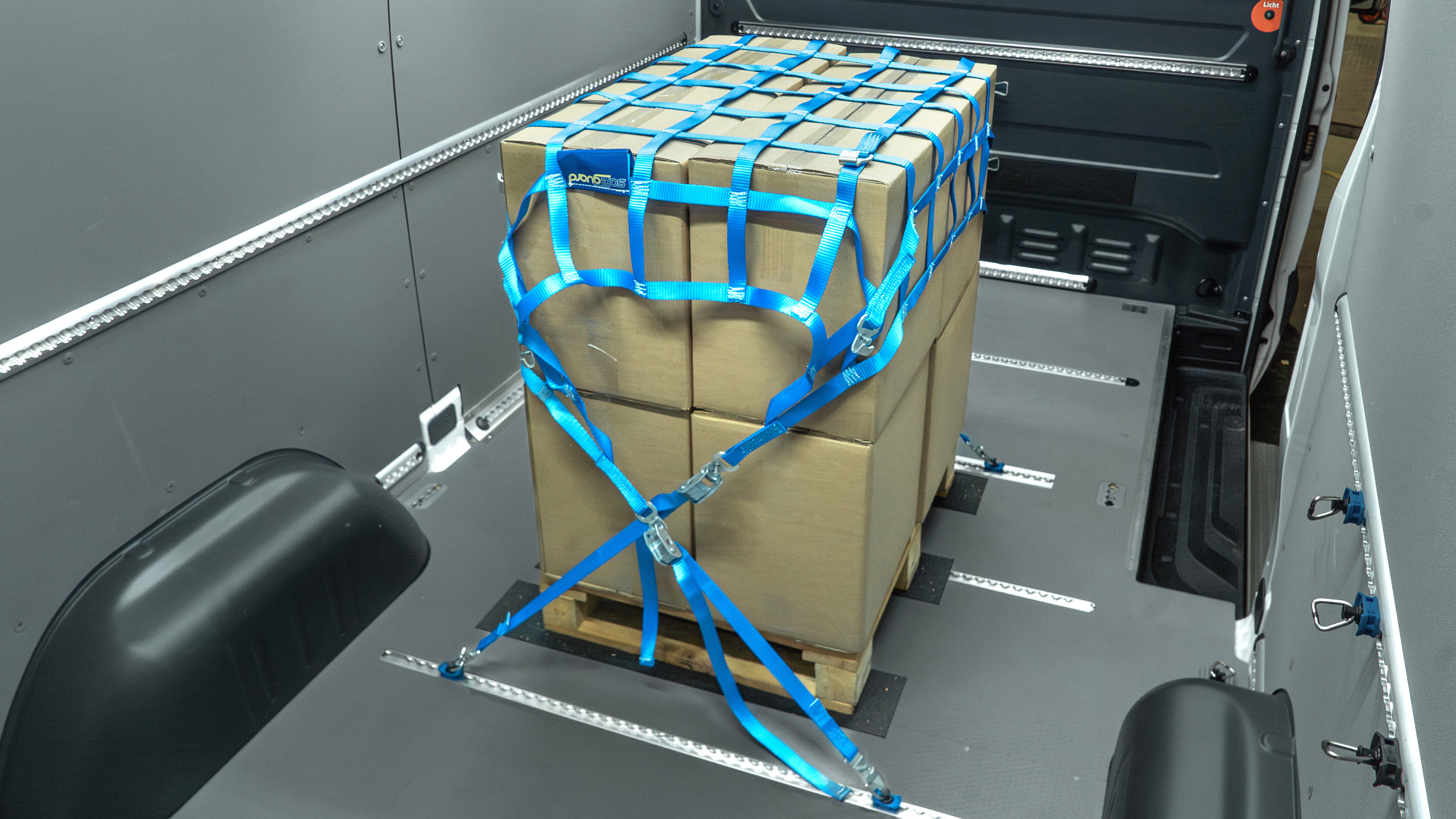 Das blaue Ladungssicherungsnetz lässt sich über Flachhaken auf drei verschiedene Größen anpassen. An den Ecken und nach innenzulaufend befinden sich jeweils ein Flachhaken mit Sicherung, zudem besitzt das Netz vier Adaptergurte zur problemlosen Befestigung. Das Netz wird über Kreuz mit Ratschen gespannt und hat zum Festmachen Flachhaken sowie Airline Fittinge.
