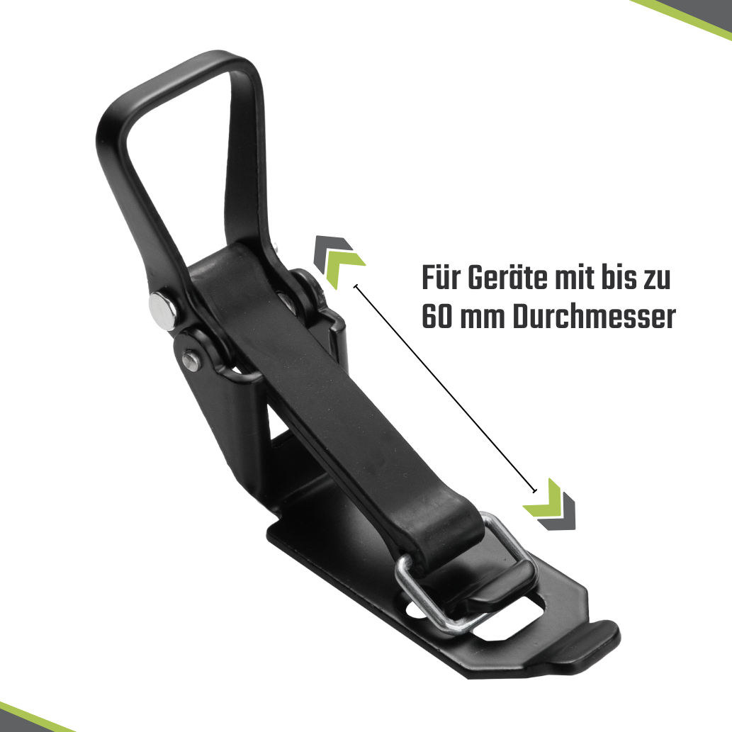Das praktische Clip‑On‑Design ermöglicht eine einfache Montage. Die Tragfähigkeit liegt bei ca. 20 kg und macht den Halter auch für schwere Werkzeuge bestens geeignet.